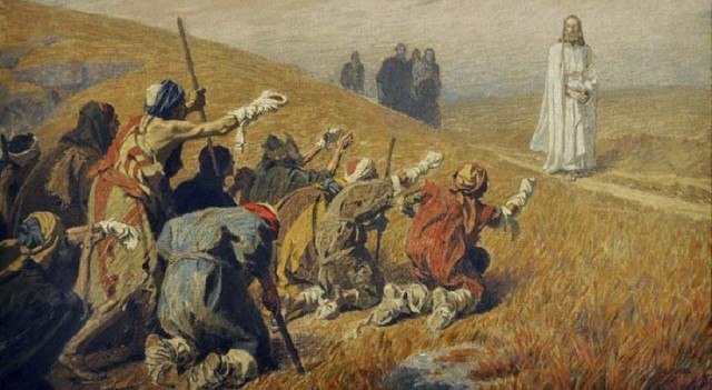 “entrando Jesus em uma aldeia, saíram-Lhe ao encontro dez leprosos, que pararam ao longe e levantaram a voz dizendo: Jesus, Mestre, compadece-te de nós. E Jesus, logo que os viu, disse: Ide, mostrai-vos aos sacerdotes. E aconteceu que, enquanto iam, ficaram limpos. Mas um deles, quando se viu limpo, voltou atrás, engrandecendo a Deus em alta voz; e prostrou-se por terra aos pés de Jesus, dando-Lhe graças; e este era um Samaritano. E Jesus disse: Porventura não foram dez os curados? Onde estão os outros nove? Não se achou quem voltasse e viesse dar glória a Deus, senão só este estrangeiro”.